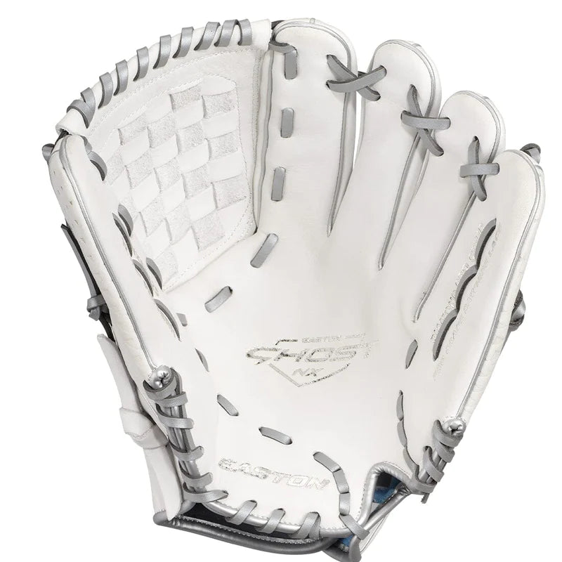 Easton's Ghost series is a symbol of elite fastpitch play. The Ghost NX 12.5-inch Fastpitch Pitcher/Infield glove fits right in. These gloves were crafted in gameday-specific patterns designed for smaller hands and perfectly suited to the fastpitch game. On the outside, the Game Ready Diamond Pro Steer leather and Flex Notch closure system make this glove super soft and easy to handle right away. The Quantum Closure System on the glove back ensures a perfect fit for every player, and the interior Ax Suede microfiber lining creates unmatched comfort and durability. Also, the striking white-and-blue colorway and professional-grade silver metallic rawhide lace are sure to turn heads.