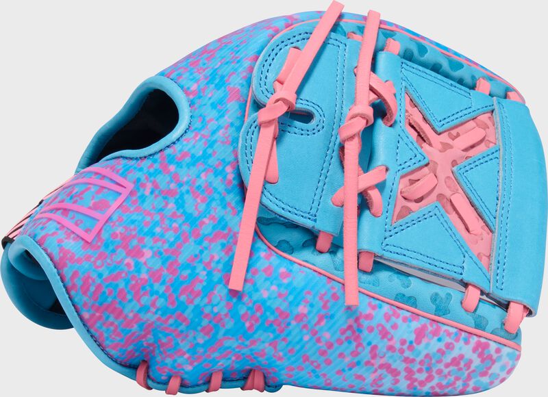 This glove's vibrant design features a stunning blue and pink speckled pattern that pops with energy and flair. The palm shell is crafted with premium light blue leather, while pink laces and accents provide the perfect contrast to its eye-catching look. Designed with REV1X technology, this glove delivers unmatched durability, lightweight feel, and cutting-edge performance for elite infielders.